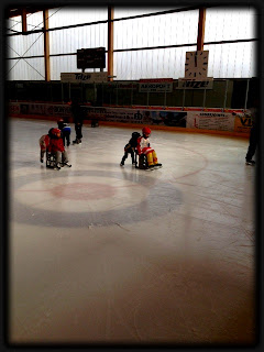 Siellä pieni isojen seassa vilisti menemään ja oli intoa täynnä ja taidollisestikin pesi kyllä monet isommat ja sai paljon kannustusta niin valmentajilta kuin yleisöstäkin. Ja poikahan nautti! Hymyssä suin luisteli pitkät treenit ja oli kokoajan mukana, vaikka tuskin kaikkia ohjeita edes ymmärsi ;) Loppukevennykseksi kisailtiin tälläisissä tunnelmissa, eikä isomman luistelukaverin kokokaan haitannut menoa ;)